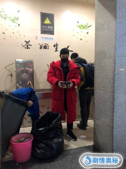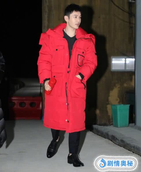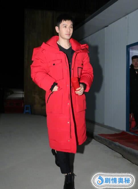 黄晓明去井冈山参加分会场的彩排,身穿红色羽绒服,相当喜庆,在火车站和普通人一样,接开水泡方便面吃,戴着黑色口罩,相当接地气。