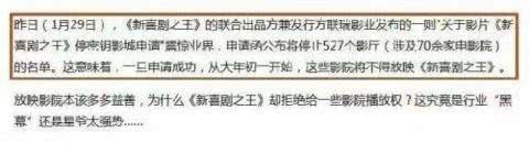 《新喜剧之王》今年春节档与院线闹翻也无奈,目前双方各执一词公说公有理婆说婆有理。据悉片方申请停止527个影厅密钥供应,这是双输的局面,星爷的新片成最大输家无疑了,影院大不了把场次排给其他影片也能卖到票房。当然周星驰也不是吃素的绝不低头,他有强大的号召力做后盾就是这么硬气,这几日预售票房一路飙升逆袭升至第二,直接打脸了某些影院的脸。