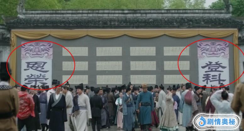 小公爷和顾二叔放榜的这个墙是挺气派的,就是这彩色的海报纸有点太先进了吧。还有字下面的那个穿红色塑料袋的男子,哈哈,你的大红衣服实在是眨眼,都抢了各位姑娘们的戏了。