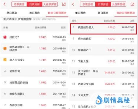 今年春节档,由于大年初一上映的重磅新片多达8部,而且第一梯队的《疯狂的外星人》《新喜剧之王》《飞驰人生》等三部影片预售票房成绩比较接近,第二梯队的《流浪地球》预售表现也相当抢眼,导致了单部影片预售票房被严重分流,加之去年10月1日起取消线上票补,截至2月4日8点,今年大年初一单部影片预售票房成绩远不如去年同期。即使算上2月4日全天的预售,《疯狂的外星人》预售票房不仅与去年预售冠军《捉妖记2》有很大差距,甚至有可能不如去年春节预售第二名《唐人街探案2》。