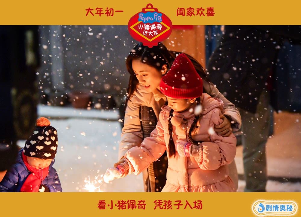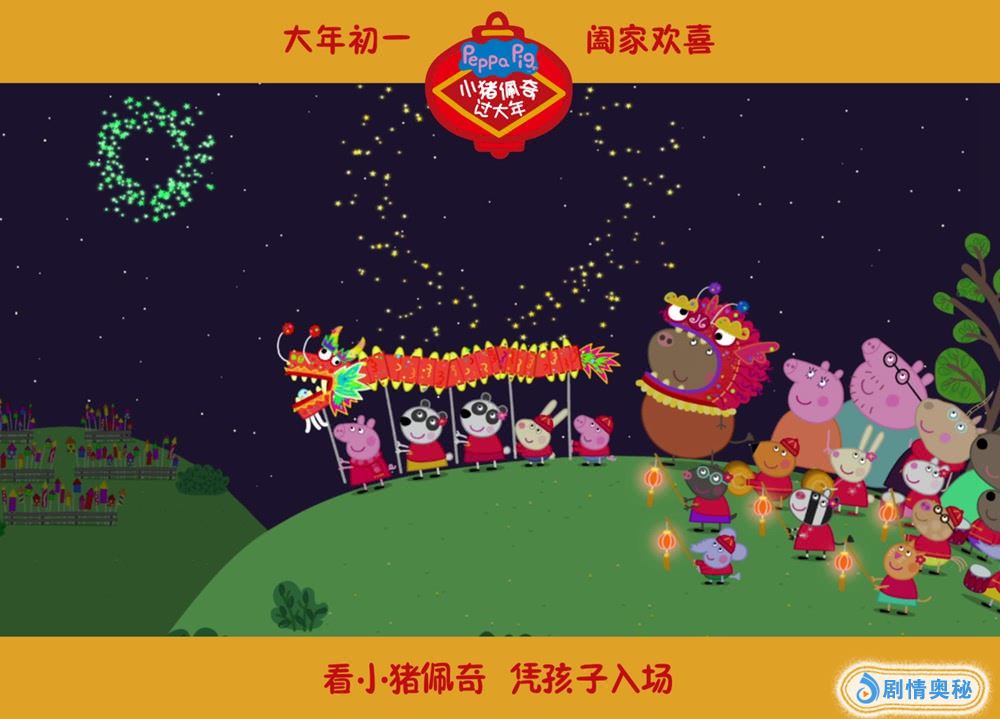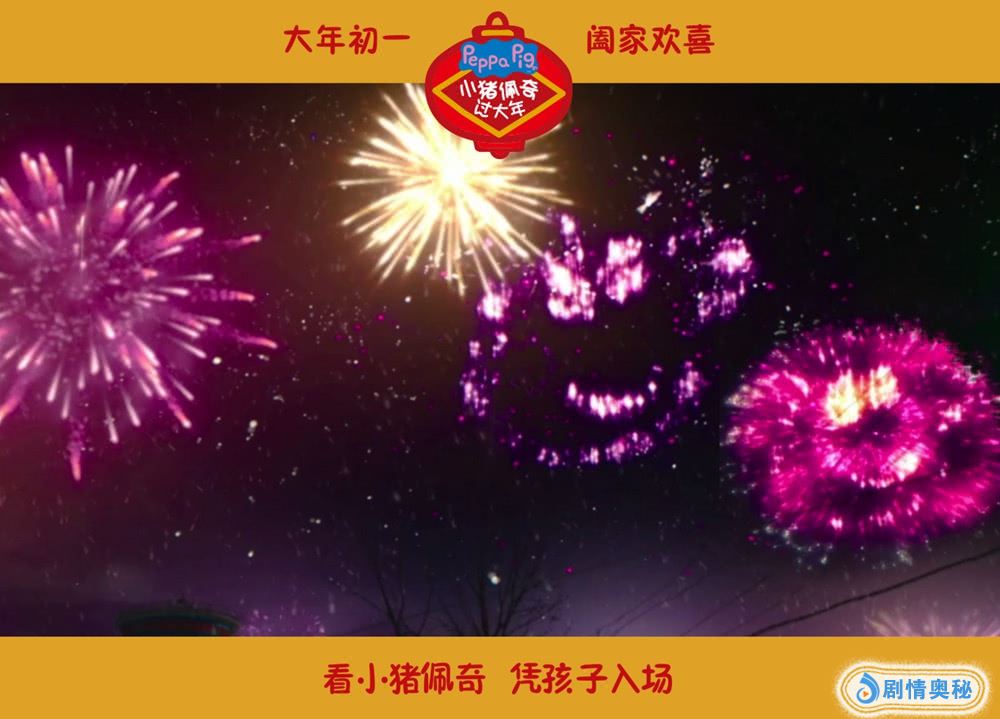 在“团圆夜”片段中,佩奇与小伙伴们在大年夜为大家献上了一场喜萌的舞龙舞狮表演,随后开始的烟火倒数更是让佩奇发出感叹:“这绝对是我度过的最棒的春节了”。当大幕再次拉开,空间切换至佩奇中国家人们的大年夜,“爸爸”朱亚文和“妈妈”刘芸一家八口在大雪纷飞中同样欣赏着满天烟花,“小狗丹尼”轮廓渐渐淡去,“小猪佩奇”照得夜空亮如白昼,猪年在温暖团圆的气氛下到来。现实与动画相穿插,两个猪猪家庭的甜蜜正是千家万户对完美除夕夜的祈愿,正所谓:啥是佩奇?一家人热热闹闹在一起,就是佩奇(配齐)了。