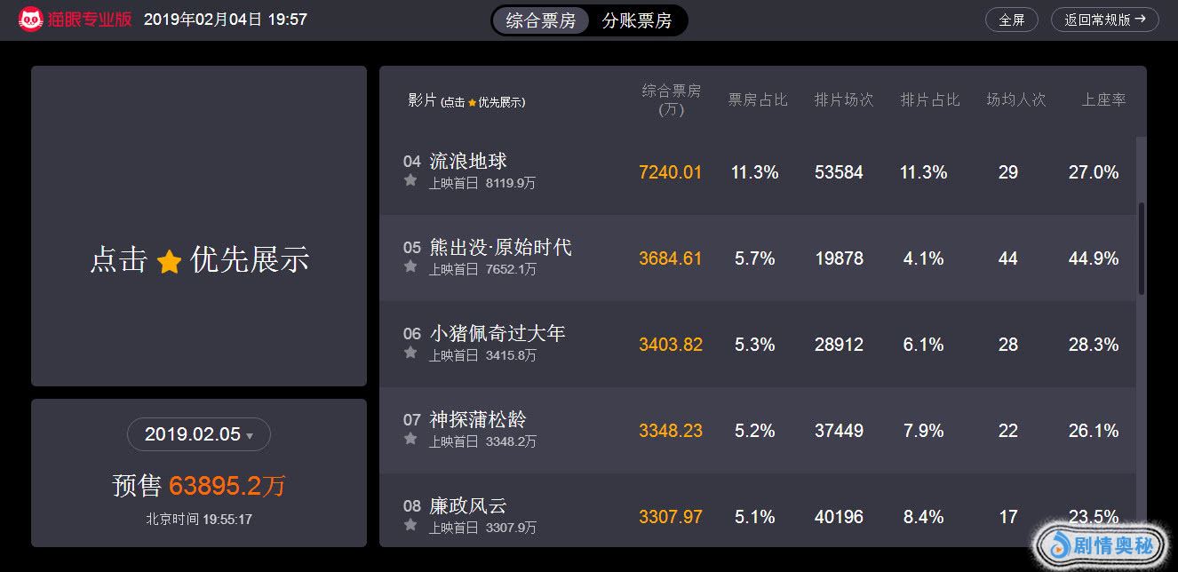 从猫眼专业版实时票房数据显示,即将上映的8部影片中,《疯狂的外星人》、《飞驰人生》、《新喜剧之王》纷纷以预售破亿的成绩位居贺岁档前三位置,而吴京的《流浪地球》位居第四,成龙作品《神探蒲松龄》不敌两部动画电影《熊出没》和《小猪佩奇》跌至了第七,港片反腐力作《廉政风云》垫底。