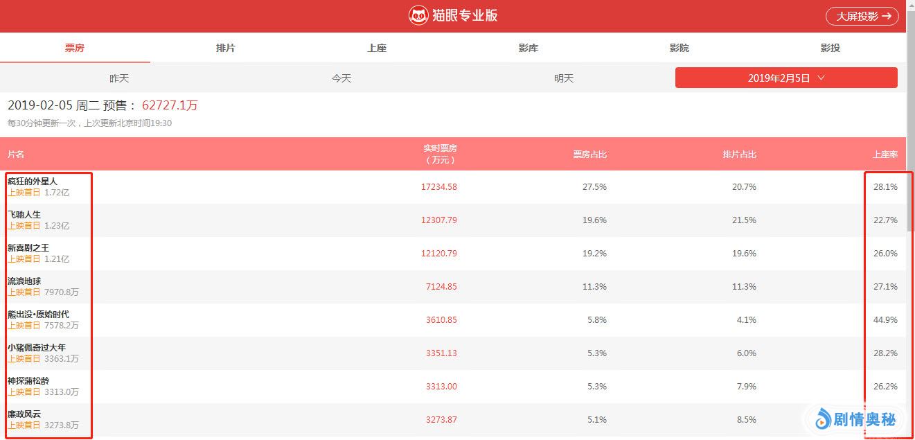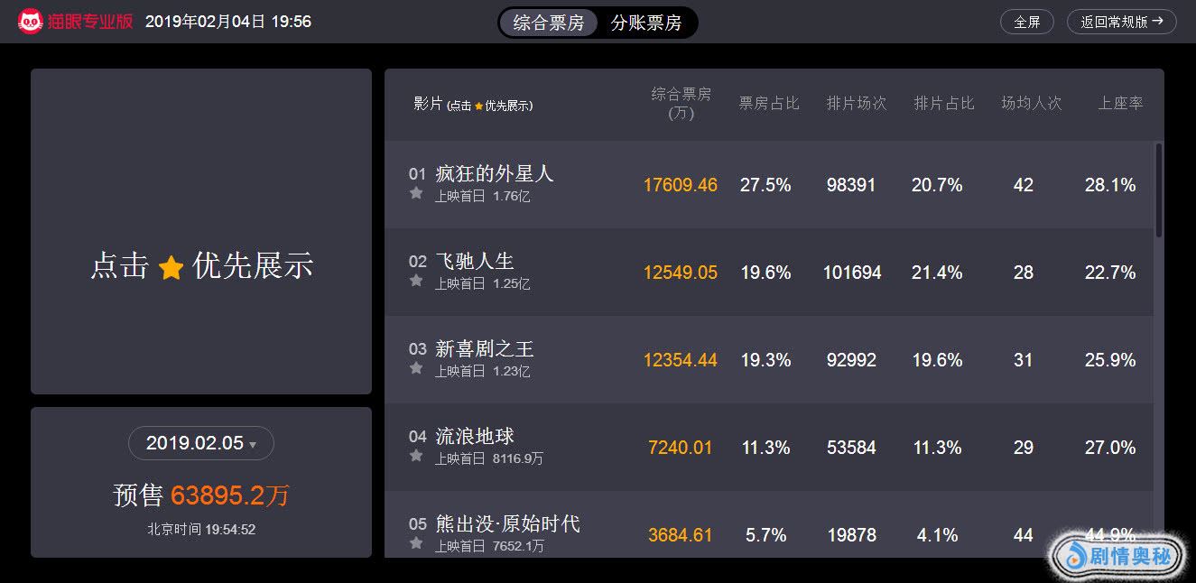 截止发文时间,8部影片预售票房数据如下:《疯狂的外星人》以预售1.72亿,上座率28.1%位居第一,《飞驰人生》以预售1.23亿,上座率22.7%位居第二,《新喜剧之王》以预售1.21亿,上座率26%位居第三,《流浪地球》以预售7970.8万,上座率27.1%位居第四,《熊出没·原始时代》以预售7578.2万,上座率44.9%位居第五,《小猪佩奇过大年》以预售3363.1万,上座率28.2%位居第六,《神探蒲松龄》以预售3313万,上座率26.2%位居第七,《廉政风云》以预售3273.8万,上座率23.6%位居第八。