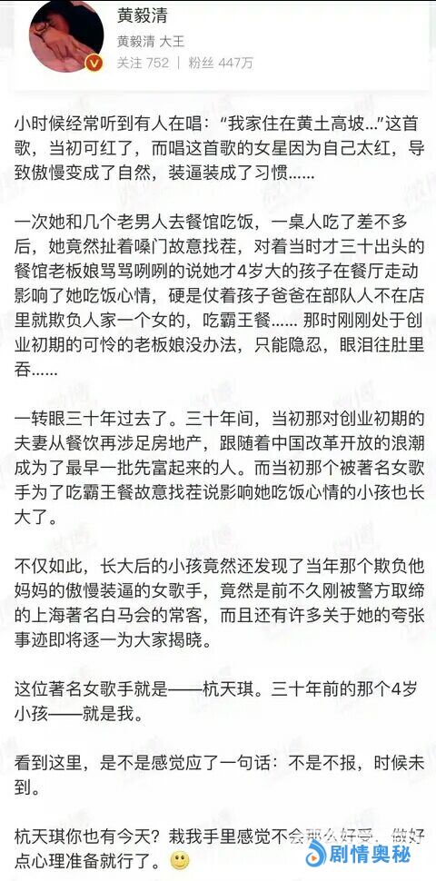 黄毅清虽然经常满嘴跑火车,放大炮,但是这一次,很多网友选择站队黄毅清,觉得他的爆料应该是真的。甚至有人说,这是一个隐忍了30年为母报仇的励志故事。