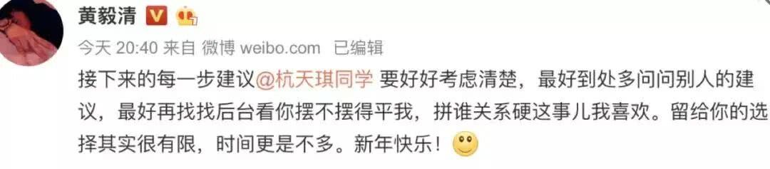 这一场撕逼大战,估计要贯穿这个春节了。杭天琪后续如何回应,黄毅清还会爆料什么,吃瓜群众都在坐等了。