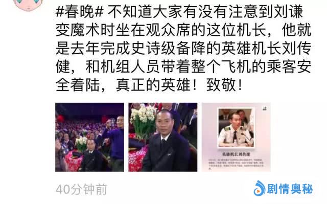 刘谦今年是拿了给魔壶给大家变了个魔术,当走到台下问台下一位大叔喜欢喝身的时候,旁边的男士被看出是一位有故事的观众。原来他就是现代版的英雄,去年就是他完成史诗级备降的刘传健机长,他带着整个飞机的乘客安全着陆,挽救了全飞机180多名乘客的性命。