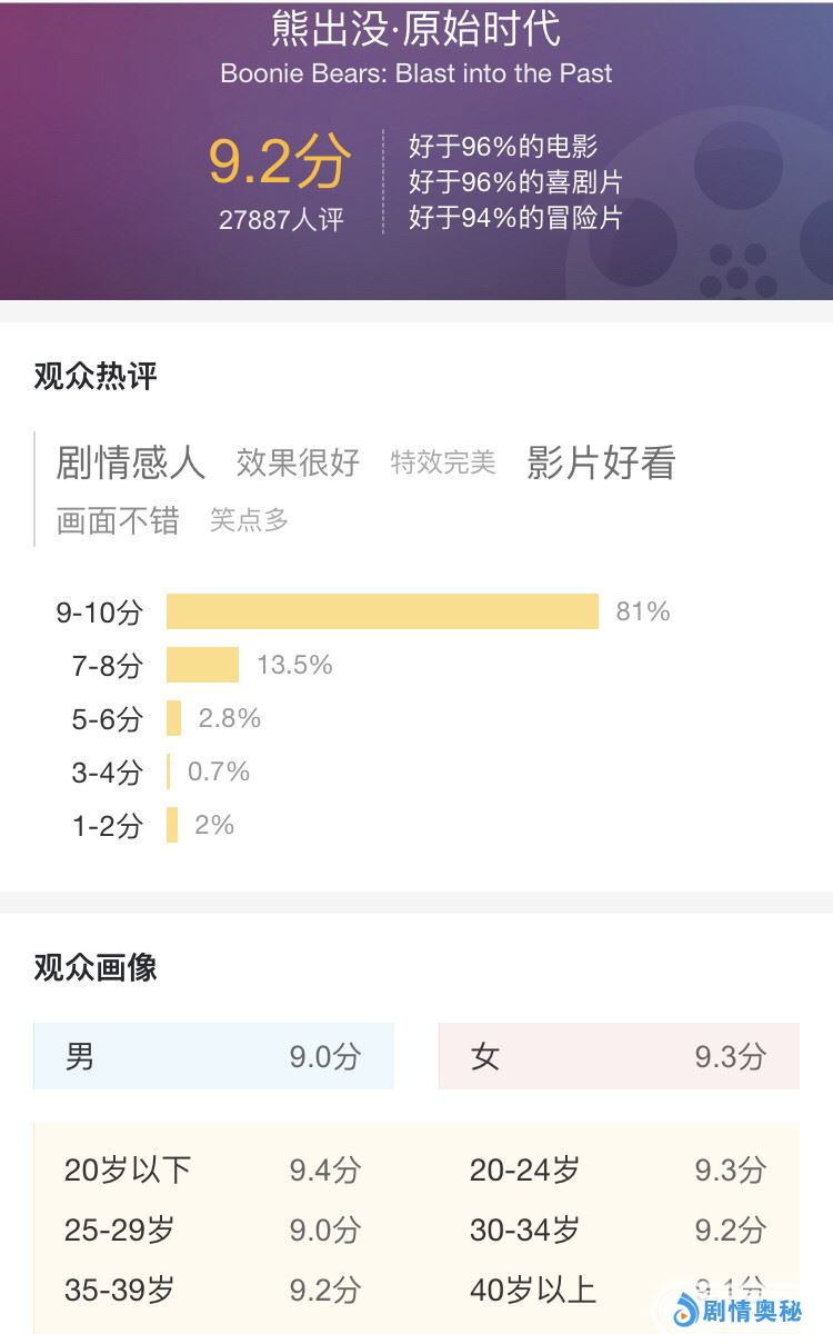 据猫眼专业版数据显示,截止2月5日上午8点24分,《熊出没·原始时代》票房累计8665.2万,猫眼购票观众评分9.2。好于%96剧情片,%94的喜剧片,有81%的观众给出了9—10分的高分好评,男性评分9.0,女性评分9.2,最受00后观众欢迎,全年龄段观众都给出了9分以上的好评。