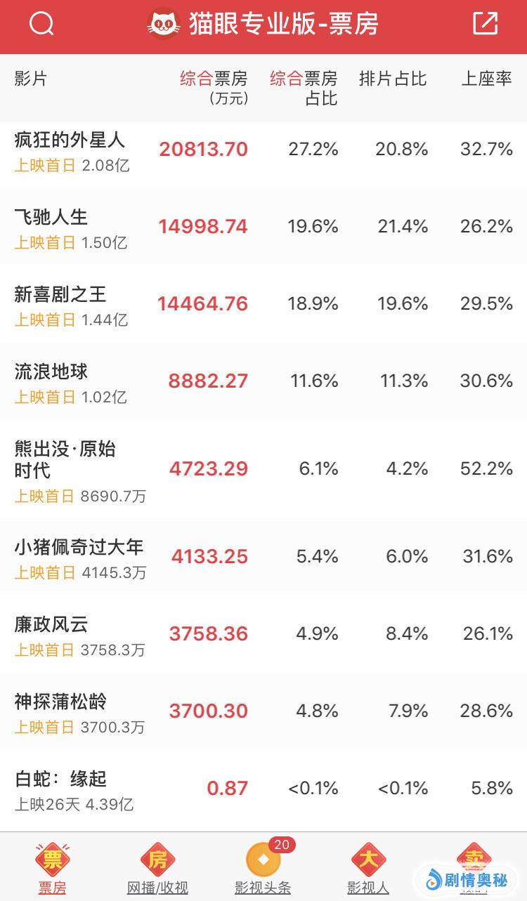 此外,《熊出没·原始时代》票房累计8665.2万,上座率达52.2%,排名春节档影片第一。
