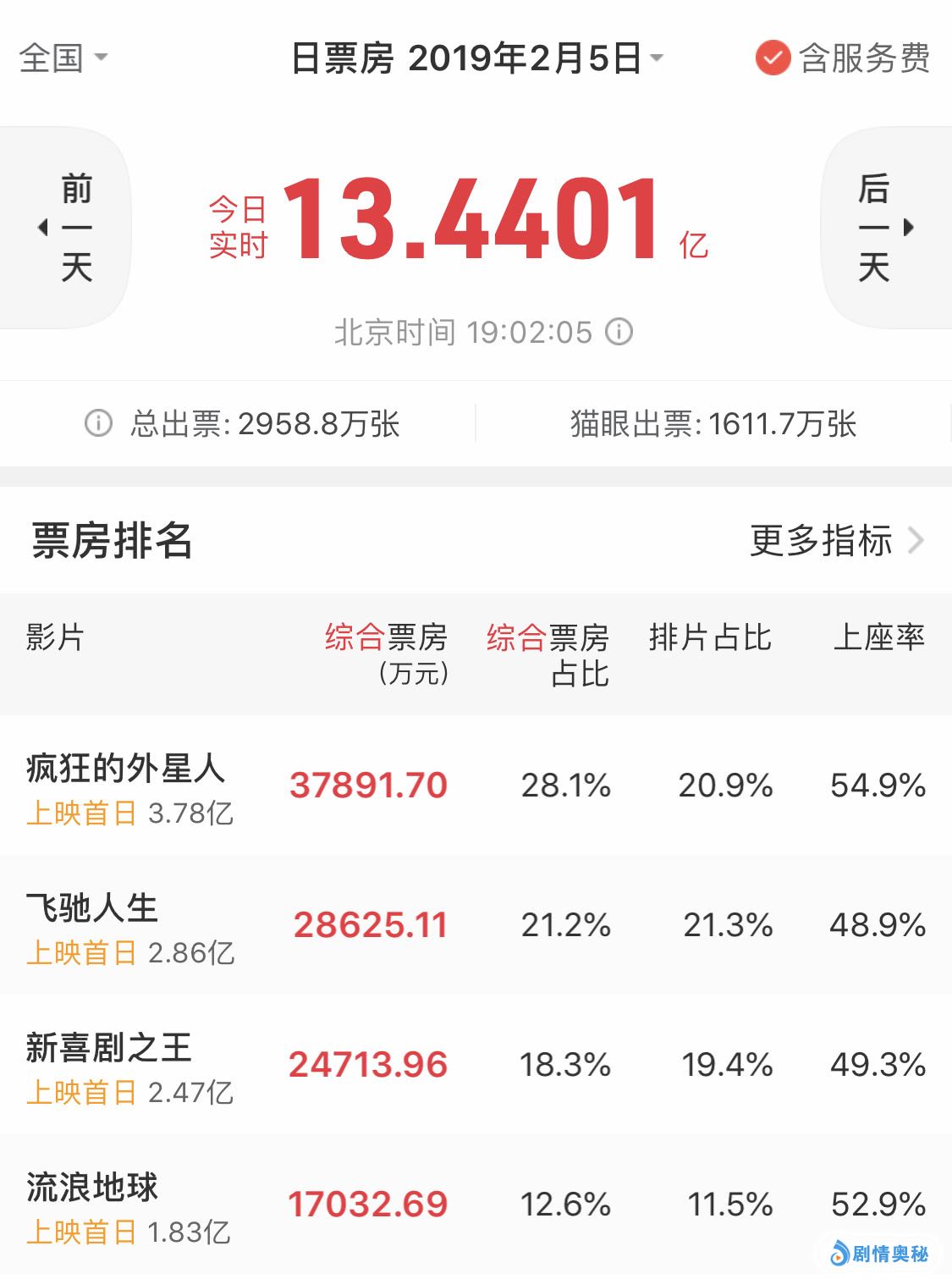 观众们火爆的观影热情,也直接体现在了火爆的票房成绩上了,从票房实时统计数据来看,截止晚上19时,当天的国内院线总票房已经突破了13亿,要知道19点意味着晚间黄金时间段才刚刚开始,今天的总票房成绩还将进一步升高。
