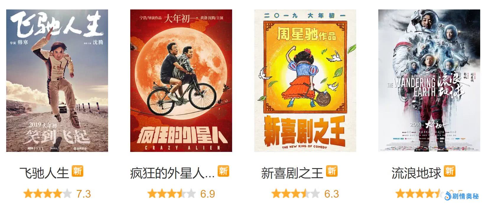 目前,春节档大片评分均出炉了,这4部电影的评分也相继出来了,在豆瓣电影上,《疯狂的外星人》 评分6.9分,《飞驰人生》评分7.3分,《新喜剧之王》评分6.3分,《流浪地球》评分8.5分。