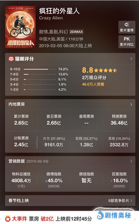 从数据来看,截止到上映首日(2月5日)13点,《疯狂的外星人》累计票房已超过2.6亿,并得到在大年初一同档期影片中累计票房、想看人数排名第一的成绩。