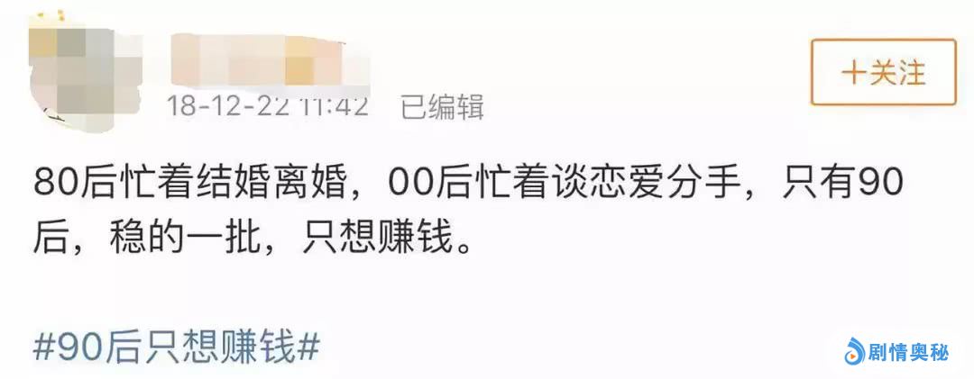 但就像微博一些网友调侃的,80后和00后都在急着处理感情的事,而90后,只想“赚钱”!