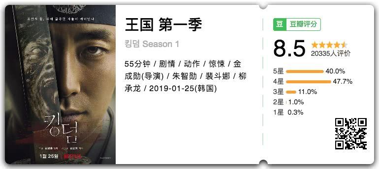 该剧是网飞制作的首部韩国原创电视剧,剧中爆发丧尸的东莱,正是现在釜山的一个区,所以《王国》也被称为“古装版《釜山行》”,目前豆瓣评分甚至比《釜山行》还高,达到8.5分。