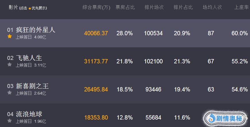 从《流浪地球》首日1.95亿的票房来看,或许比起《疯狂外星人》的4亿,《飞驰人生》的3.1亿,《新喜剧之王》的2.6亿,有着很大的差距。但是如果《流浪地球》有着同样高的排片,那么估计首日票房完全有希望破4亿,完全不会输给《疯狂的外星人》。
