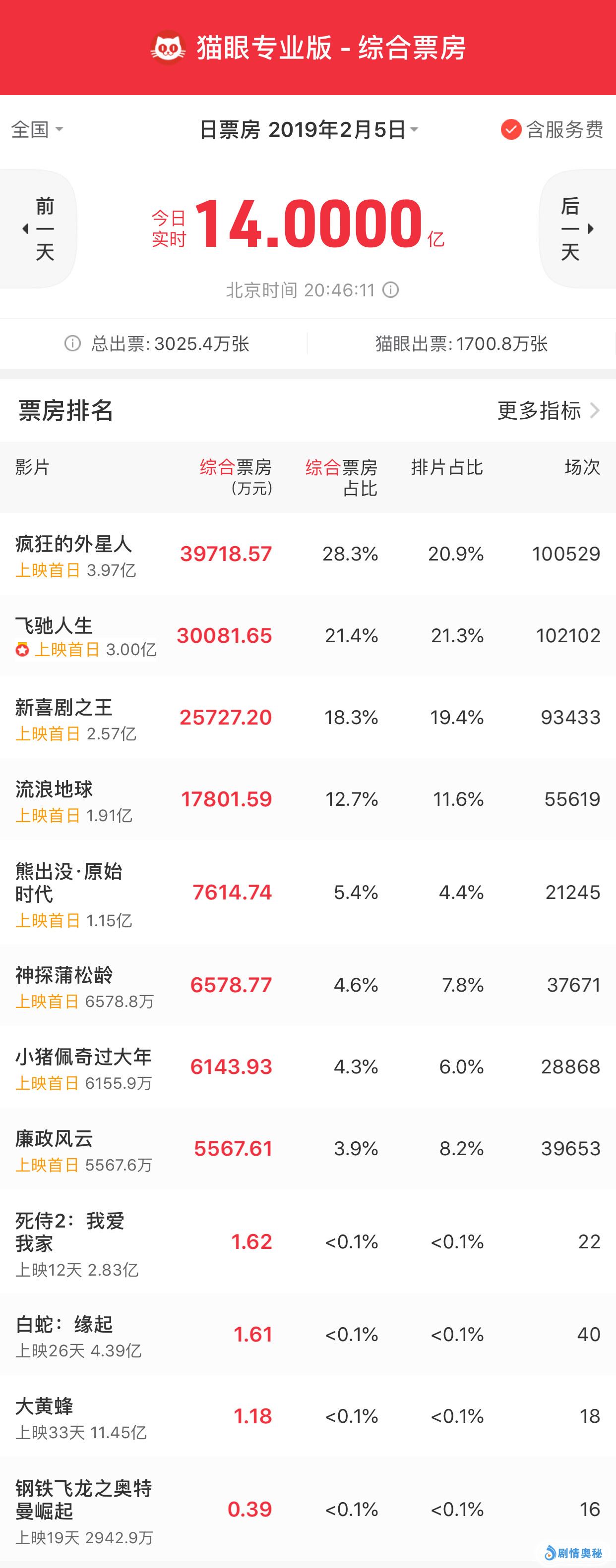 根据猫眼专业版数据表明,截止至2月5日20点26分11秒,春节档首日票房累计已经突破14亿人民币,成为了全球单一市场单日票房新纪录。《疯狂的外星人》以超过3亿9千7百万的春节档首日票房领跑榜单。