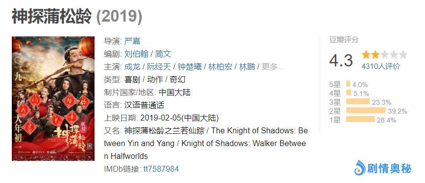 作为春节档唯一的合家欢电影,再加上成龙的强大号召力,自然有不少观众对影片报以极高的期待,然而电影质量实在不敢恭维,台词和情节尴尬,特效同样让人失望,豆瓣评分仅4.3分,绝对是春节档最糟糕的电影之一