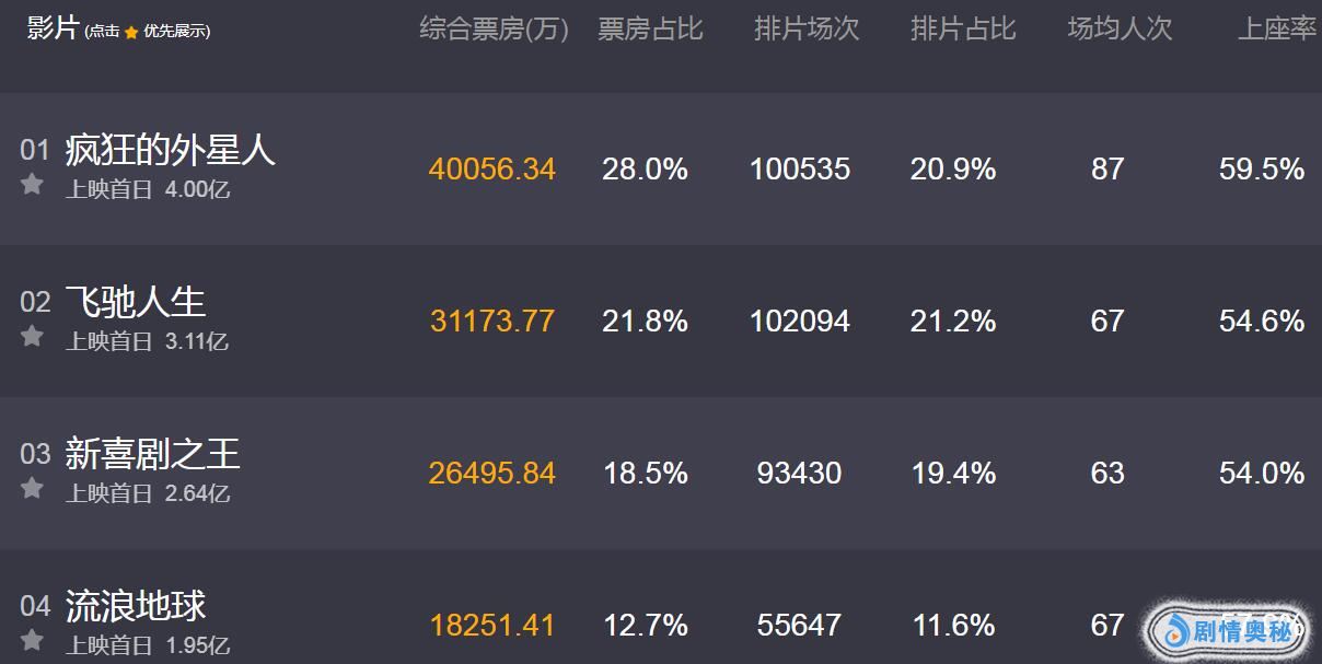 《疯狂的外星人》首日放映10万场次,排片量占比20%,虽然放映规模没占到优势,但是上座率却甩开了对手老远,场均86观众鹤立鸡群。目前实时4亿元(截止21点20),今天全天收4.2亿以上稳了,这个开画创下单日历史第二高纪录。《飞驰人生》票房也很猛目前也冲破了3.1亿,《新喜剧之王》低于预期仅收到2.64亿,《神探蒲松龄》最扑街连7000万都没收到。