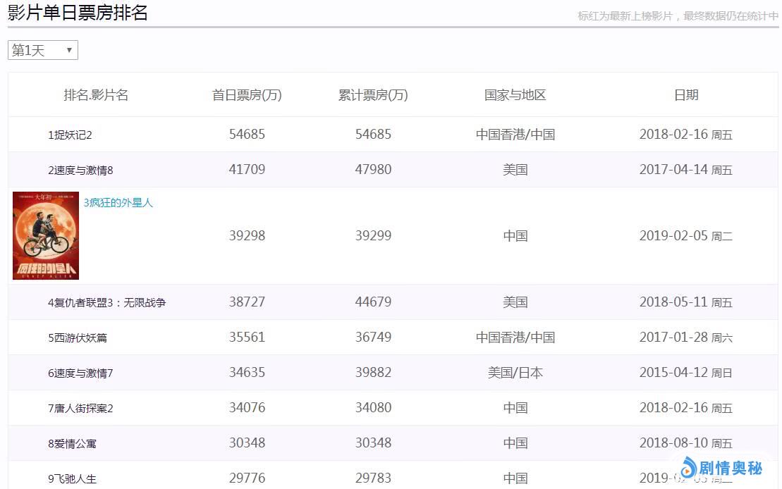 目前内地历史首日开画最高纪录是《捉妖记2》5.4亿元,进口片《速度与激情8》4.1亿排名历史第二,不过它这个纪录马上要作古了,《疯狂的外星人》今天全天票房就能超过它。票房王相互抱团这个威力大家见识到了,宁浩,沈腾,黄渤,这个组合阵容太吸引人了,他们这部新片票房大爆夺冠实至名归。