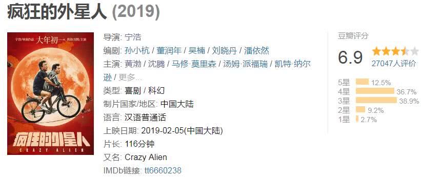 《疯狂的外星人》首日票房轻松夺冠,口碑也赢得了观众好评,豆瓣6.9分对国产片来说算优秀了。该片票房大爆很多都预料到了,从导演到主演都是“票房王”级别的,宁浩上一部导演作品《心花路放》就夺得国产片年度票房冠军,沈腾黄渤去年暑期档作品票房大卖,三位卖座王联手还有谁能敌?