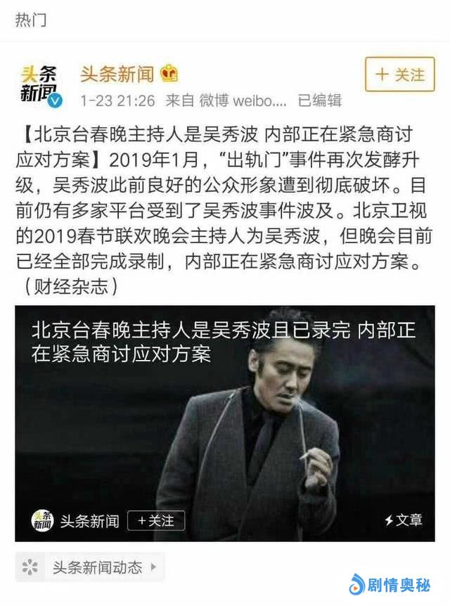 当时就有消息称,吴秀波“出轨门”事件曝出后,北京电视台内部都闹翻天了,不得不紧急商讨应对方案。后来媒体记者电话采访了负责北京卫视春晚的工作人员,被问及吴秀波春晚内容是否有变动时,对方只是表示“我们会妥善处理,一切以播出为准”。