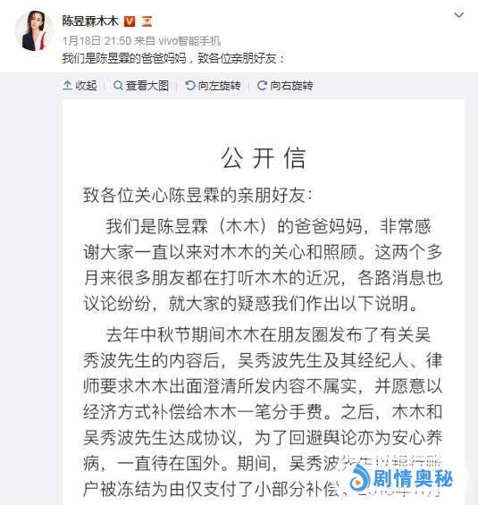 2019年1月18日,陈昱霖父母的一封微博公开信,让早前因为吴秀波的沉默而几乎平息的“出轨门”事件再次成为大众焦点。
