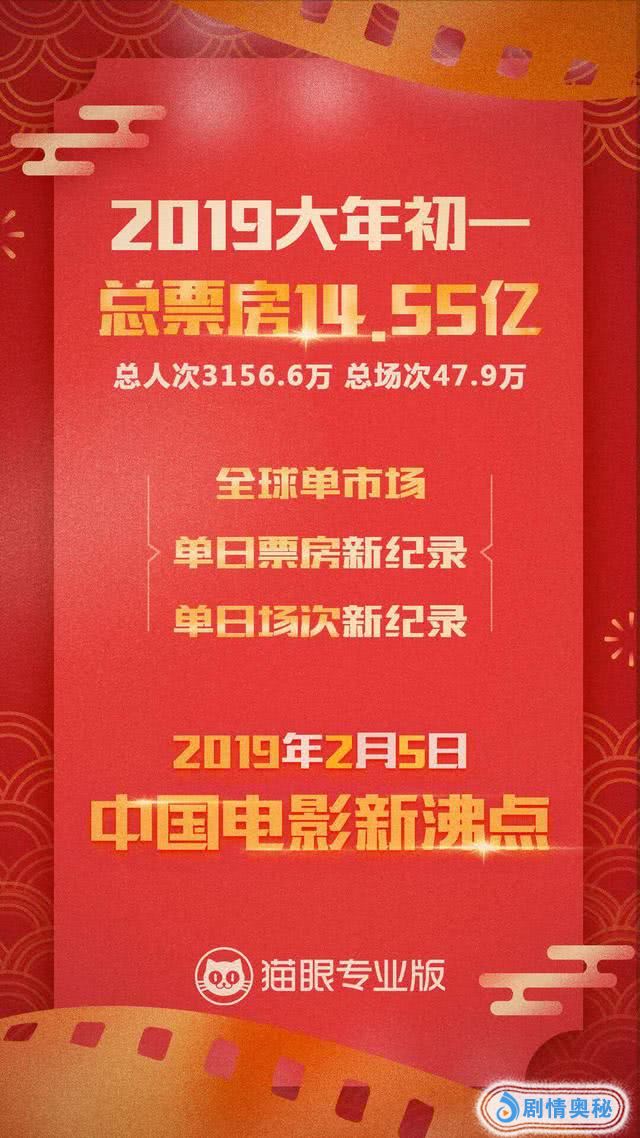 据猫眼专业版票房数据显示,截至当天24点,全天票房高达14.55亿元,超过去年大年初一的12.77亿元,创造了全球单一电影市场单日票房的最高纪录。当天有4部新片单日票房过亿,如果加上提前电影的《熊出没:原始时代》,有5部新片单日票房过亿。