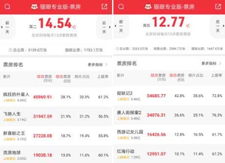 2月5日大年初一,中国内地电影市场8部重磅新片上映,当天票房再度迎来井喷。尽管官方最终统计数据尚未出炉,但据猫眼专业版票房数据显示,全天综合票房高达14.55亿元。电影资金办微信公号的预估票房是14.46亿元。无论如何,大幅超过去年同期12.77亿元,同时再度刷新全球单一电影市场单日票房最高纪录。但略显美中不足的是,单日观影人次并未超越去年的3263万,上座率也有所下降。