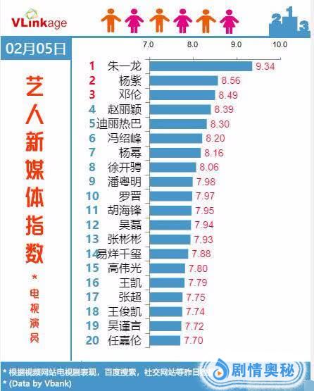榜单上第二名和第三名是杨紫邓伦,这对90后演员,在2018年暑假热剧《香蜜沉沉炽如霜》里表现抢眼,人气暴涨,年底杨紫还在央视春晚表演了小品,曝光率很高,邓伦在央视春晚表演歌曲节目《我奋斗我幸福》,现在两人主演的香蜜这部剧,还在视频网站上保持着不错的播放量。