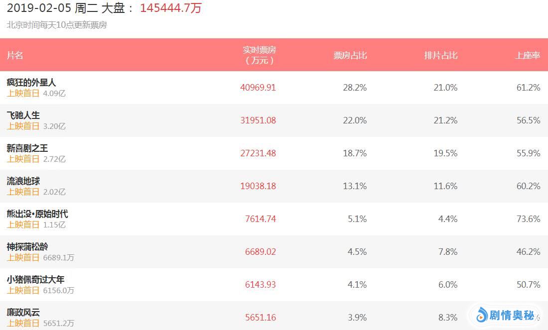 2019年春节票房大战打响了,大年初一(2月5日)春节首日票房大盘轰出14.54亿,刷新历史纪录。经过一天的票房较量,各部大片大致已分出胜负。沈腾黄渤《疯狂的外星人》票房夺冠,沈腾《飞驰人生》亚军,周星驰《新喜剧之王》仅第三,成龙《神探蒲松龄》最扑街,吴京《流浪地球》口碑最爆表。