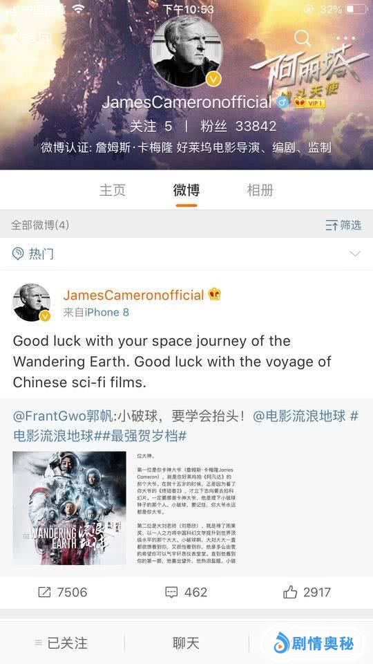 今年春节档最大的惊喜是《流浪地球》,国产片科幻片终于有了突破,该片的特效征服了观众,连好莱坞大导演詹姆斯卡梅隆都给了好评肯定。卡梅隆在社交媒体发文“Good luck with your space journey of the Wandering Earth. Good luck with the voyage of Chinese sci-fi films(希望流浪地球的太空之旅顺利。也祝中国的科幻电影之旅好运)。”