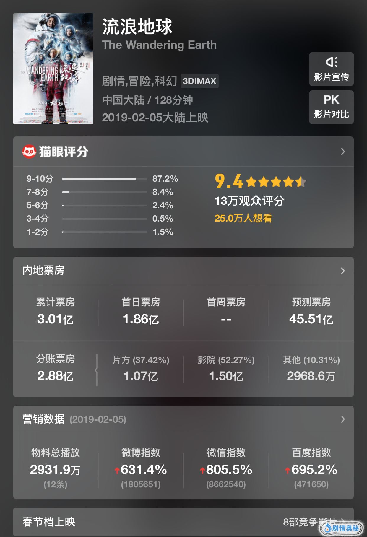 《流浪地球》在上映22小时56分后票房突破2亿,目前票房已经累计超过3亿元,猫眼购票观众对《流浪地球》的评分为9.4分,超过13万观众参与了评分。有87.2%的观众给出了9-10分的高分。而影片的开画评分为9.2,后期靠着口碑逆袭,竟然上升到9.4,目前位于春节档影片评分第一。