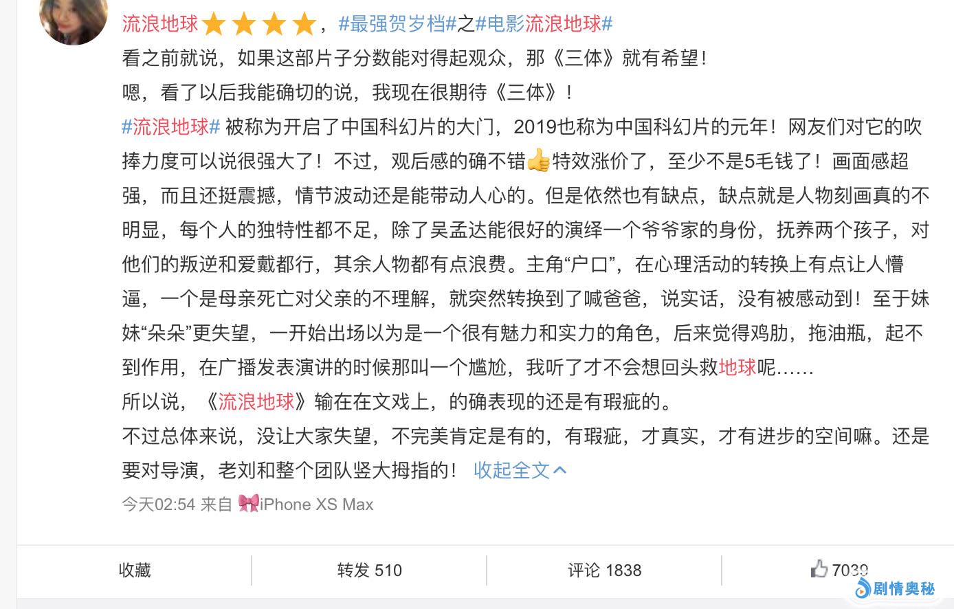《流浪地球》上映仅一天,引发了网络热议,不少观众发长文感叹,《流浪地球》作为本土科幻巨作,在滋养中国青少年想象力上意义重大。虽然与好莱坞还有一定距离,但是画面震撼,特效强大,是中国科幻的一大步。