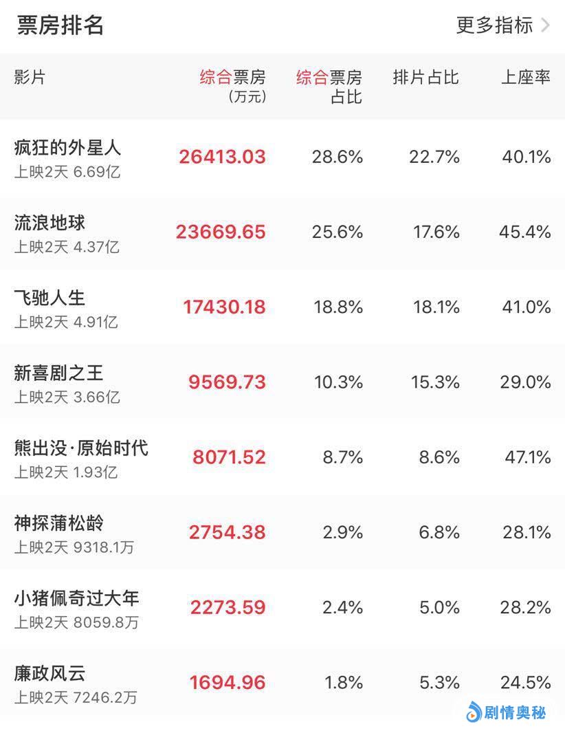 2月5日大年初一,包括2部动画片在内,八部电影同日上映打擂台。其中《疯狂的外星人》、《飞驰人生》和《流浪地球》争夺三甲难分胜负。
