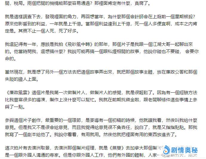 第二,电影失败、票房不佳,庄文强显然不想担责,他说参与这部电影,他只是制片人,只管前期找资金、跟老板谈条件,他在文中有一句话是“制作上没什么可以帮忙”,甩锅的意味很明显了。