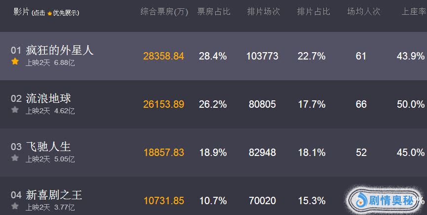 从2月6日的单日票房来看,《疯狂的外星人》虽然口碑下跌了,但是毕竟有着强大的演员阵容,依然凭借着2.8亿拿下单日票房冠军。目前影片已经累计了将近7亿的总票房,预计破10亿也是指日可待,等到下映之时完全有希望冲击30亿。