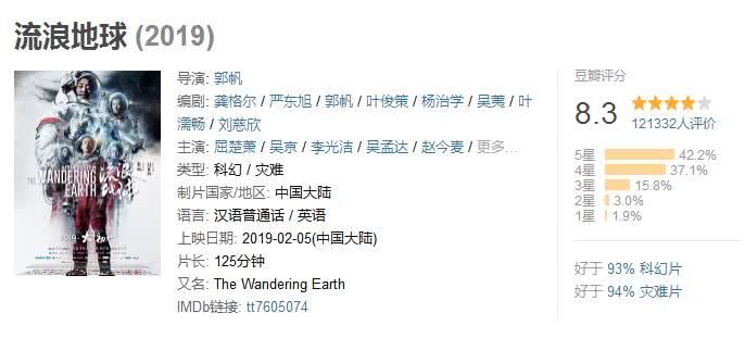 票房第三名的是《流浪地球》。昨天的评分高达8.5分,今天是8.3分,下降了2分,打分人数从4万多上升到12万多,是四强中打分人数最多的。