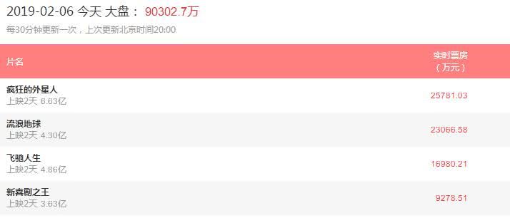 截至2月6日晚上8点,总票房突破9亿。《疯狂的外星人》依然稳坐第一,总票房6.63亿,单日票房2.5亿。宁浩沈腾和黄渤依然拥有强大的票房号召力。