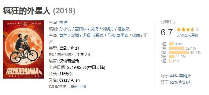 票房第一的《疯狂的外星人》,昨天评分是6.9,今天只有6.7了,下降了两分。打分人数也从2万多上升到了6万多。