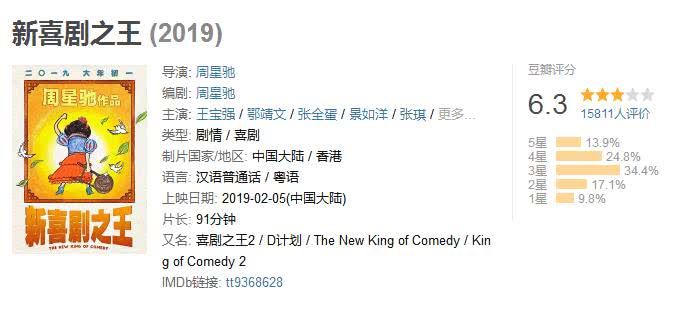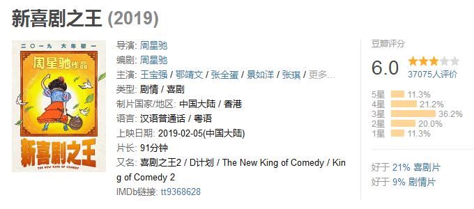 票房第四名的是《新喜剧之王》。昨天的评分只有可怜的6.3分,没想到今天只剩下更加可怜的6.0分了,下降了3分,是四强中跌得最惨的一个。而且6分对于星爷来说,真是不及格了。