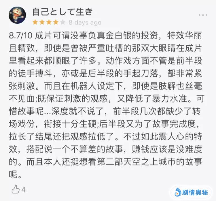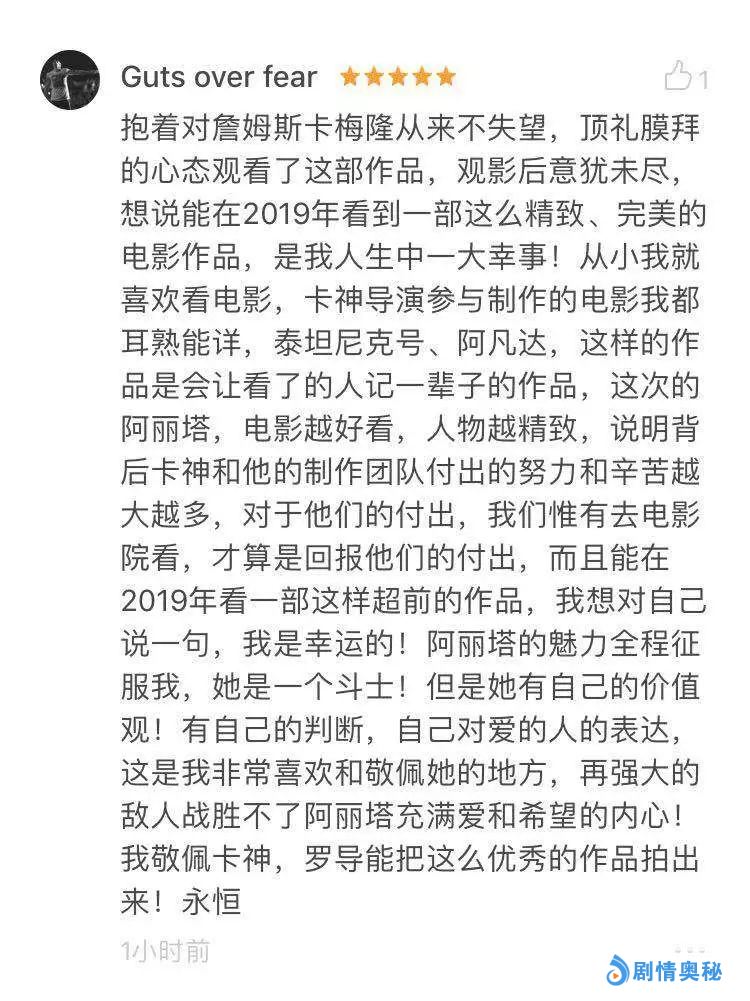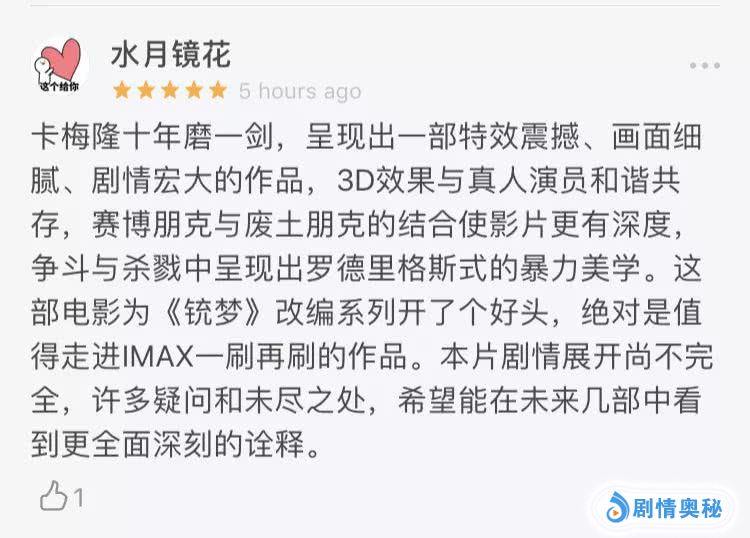看过的小伙伴们直呼:“看完意犹未尽,期待续集!”还有影迷表示:“《阿丽塔:战斗天使》是五星级的革命性巨作,通片全程高能两小时!”视效炸裂、打斗精彩、场面恢宏、期待续集……本狐已经被这些铺天盖地的好评给砸晕了~话不多说,请大家直接看图,自行划重点!