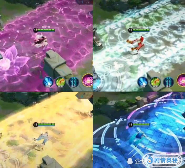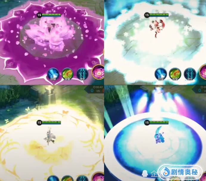 铺在一起的大招,一个粉的,一个白的,一个黄的,一个蓝的,一个似婚礼的地毯,一个似下雪,一个似遍地黄金,一个似蹦迪现场,但这四个皮肤,在一起的画面,令人觉得还是原皮好啊!没有对比就没有伤害了,花钱花的再多的皮肤
