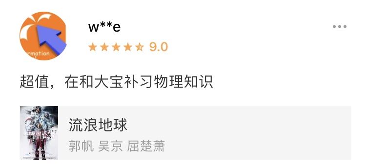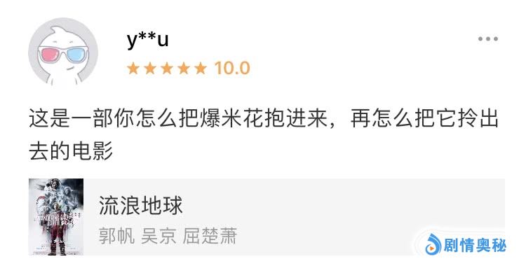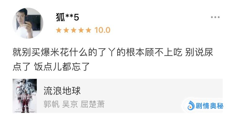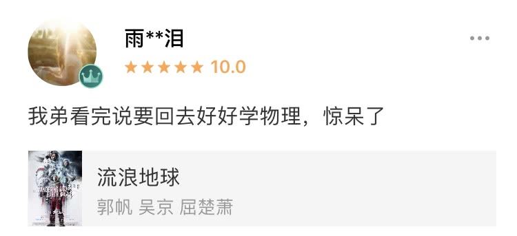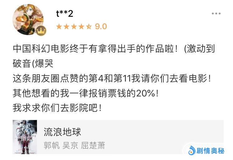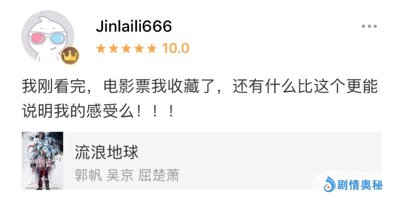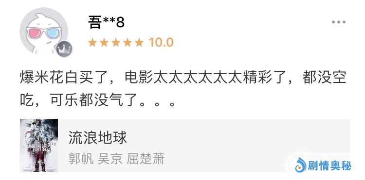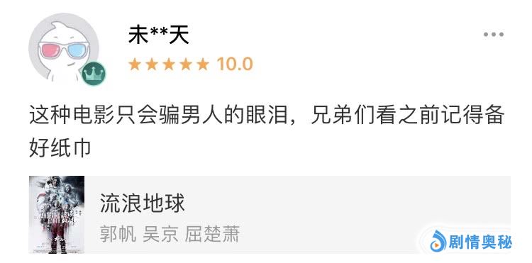 影评区的一片好评和口碑,让大家终于也能抬头挺胸地说出一句:中国的科幻大片终于开启了属于自己的元年!希望国产科幻片能越来越好!新年大家都能看到好电影!