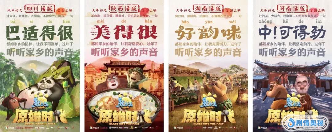 2月9日(大年初五),也就是明天,《熊出没:原始时代》的区域方言版本将会提前和观众见面;其中河南话版会在河南省和山东省点映;四川话版会在四川省、重庆省、贵州省和云南省点映;陕西话版会在陕西省点映;湖南话版将会在湖南省和湖北省电影。