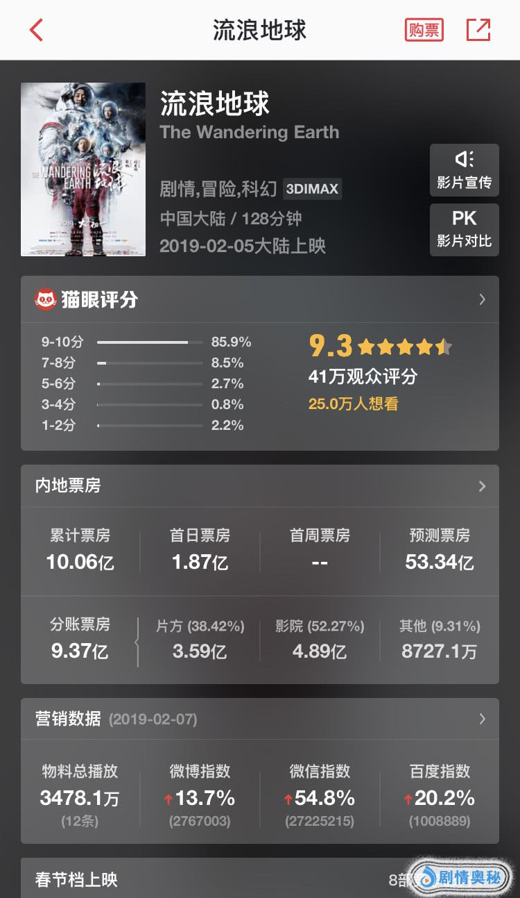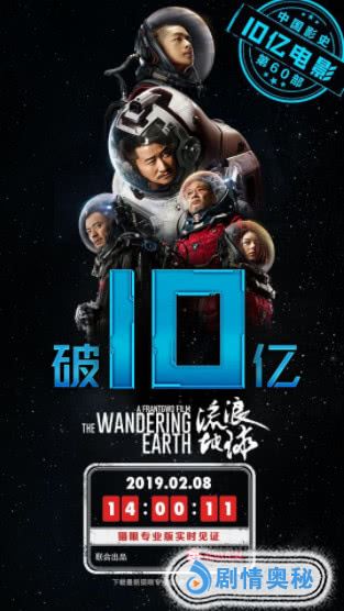根据猫眼专业版数据,截止至2月8日14点,电影《流浪地球》总票房正式突破10亿大关,猫眼评分高达9.3分,是2019年春节档第2部突破10亿票房的电影,也是中国影视第60部10亿影片。