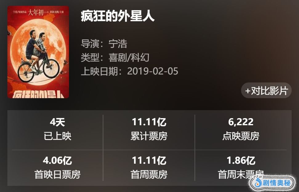 凭借超高排片优势,《疯狂的外星人》首日狂揽4.06亿票房,连续3天单日票房破2亿,目前总票房已经高达11.1亿,表现相当亮眼!
