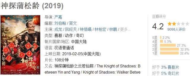成龙《神探蒲松龄》是一部古装玄幻大片,该片不仅有成龙、还有阮经天、钟楚曦、潘长江等一众明星,可谓阵容强大。但这样一部大片上映后票房却极其惨淡,上映4天总票房堪堪过亿,豆瓣只有4.3分,单日票房跌到了740万,甚至还不如《小猪佩奇过大年》的757万,真的太尴尬了。
