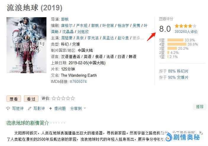 的确很认同且期待中国早该出一部硬核的科幻大片。有大刘的基础,也有郭帆的实力,当然希望《流浪地球》不仅是一部有着震撼工业视效的电影,而且是一部无论在角色塑造、故事内核还是情感共鸣上都属上乘的作品。可惜,“说好要做彼此的天使”等台词以及隋凯等角色不合时宜的低廉笑料,包括抖音等广告的植入,展现了太多妥协与媚俗,明明该记得许多壮阔的天文奇景与末日气象,可脑中最挥之不去的竟然是广播腔的“亲人两行泪”?再加上一些表演的不足,情感的干涩,还是失望的。可对郭帆和中国科幻片,仍会寄予希望,期盼国产科幻片的扛鼎之作,就在不远处。两星半不能再多,甚至豆瓣8.0有点虚高了。