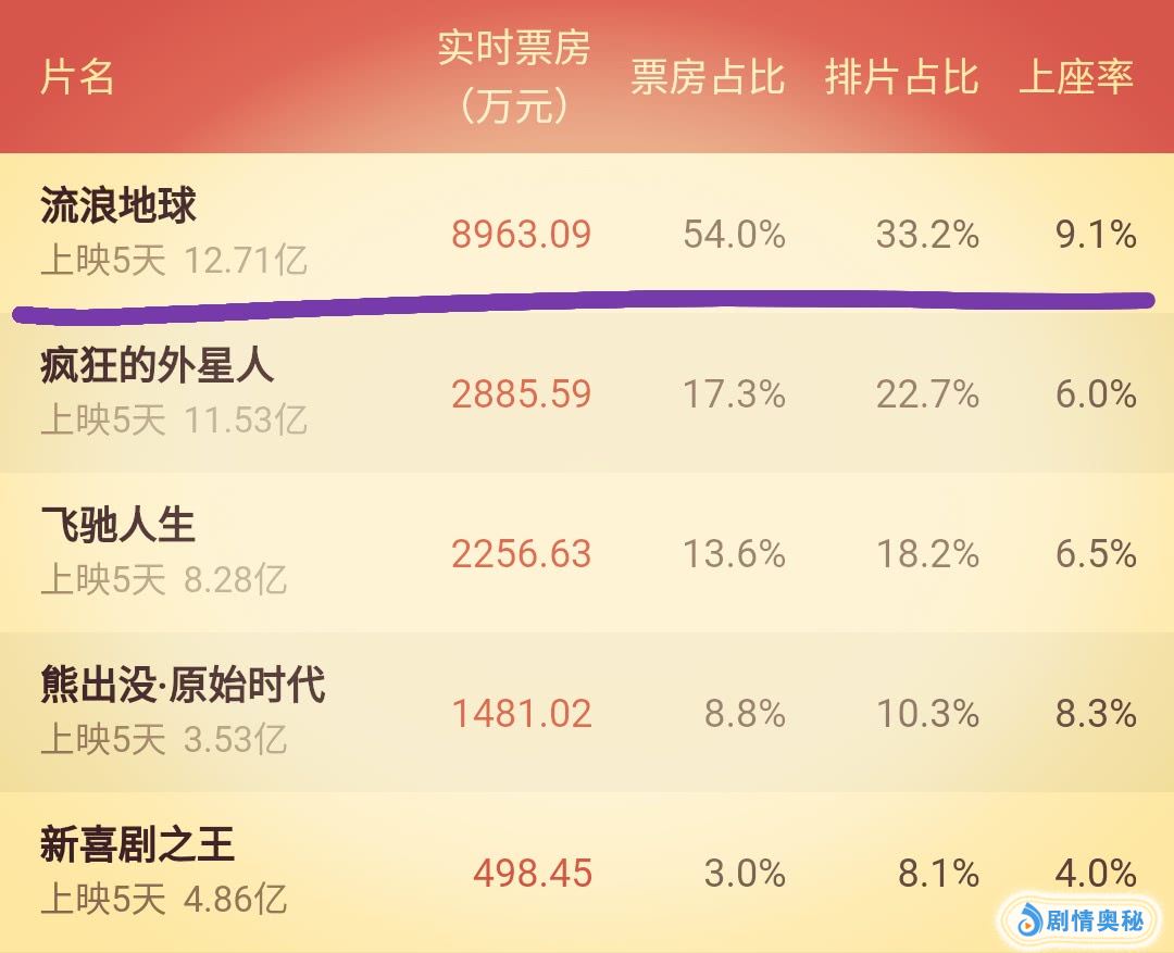 数据不会说谎:第一天2亿,第二天2.57亿,第三天3.37亿,第四天3.86亿。。。这逆生长一般的票房曲线太过曼妙。截至发稿时,《流浪地球》总票房涨至12.71亿,反超《疯狂的外星人》,更是超过星爷的《新喜剧之王》(4.86亿)两倍多!