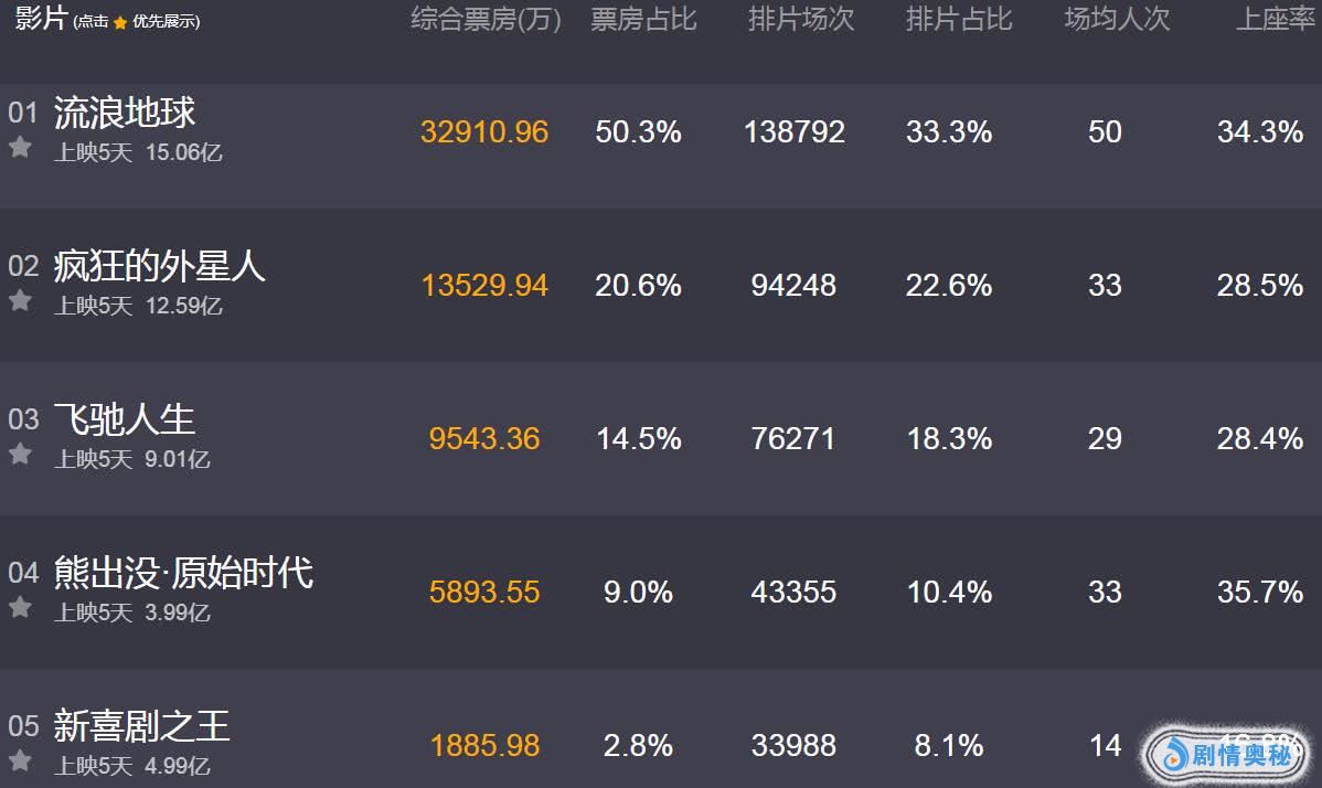 我们再来看看吴京《流浪地球》的票房后劲是什么势头?首日收2亿,次日2.5亿,三日3.37亿,四日3.81亿,五日3.29亿(截止18点)。我的天啊,不留意不知道一仔细看这个后劲太逆天了,要知道它这几天的放映场次也就10-13万场,规模上算不上占其他大片的便宜,可是吴京就是能轻松“辗压”他们,要是也给它每天15/16万场次好莱坞大片规模待遇,票房早就奔30亿去了。