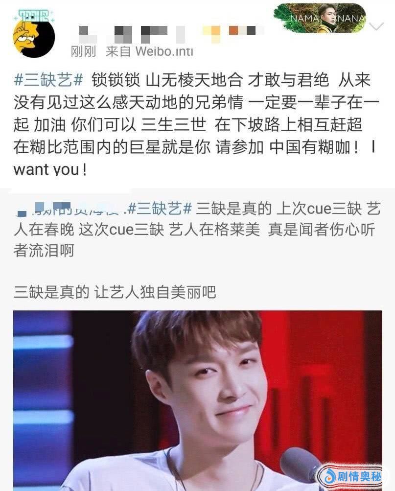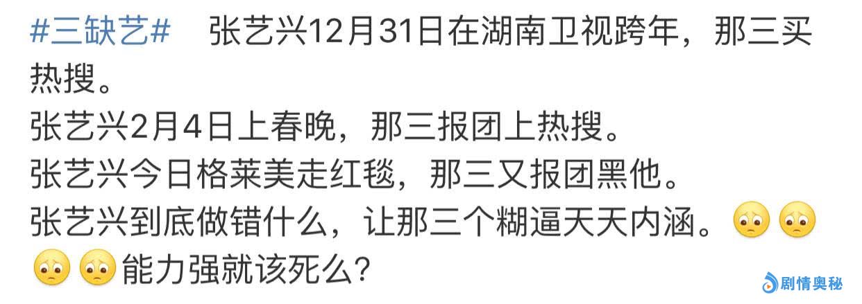 有张艺兴的粉丝列举了这三人近期的热搜:张艺兴12月31日在湖南台跨年,那三人热搜;张艺兴2月4日上春晚,那三人抱团上热搜;张艺兴参加格莱美,三人又抱团黑他,“张艺兴到底做错什么,让那三个糊b天天内涵?”